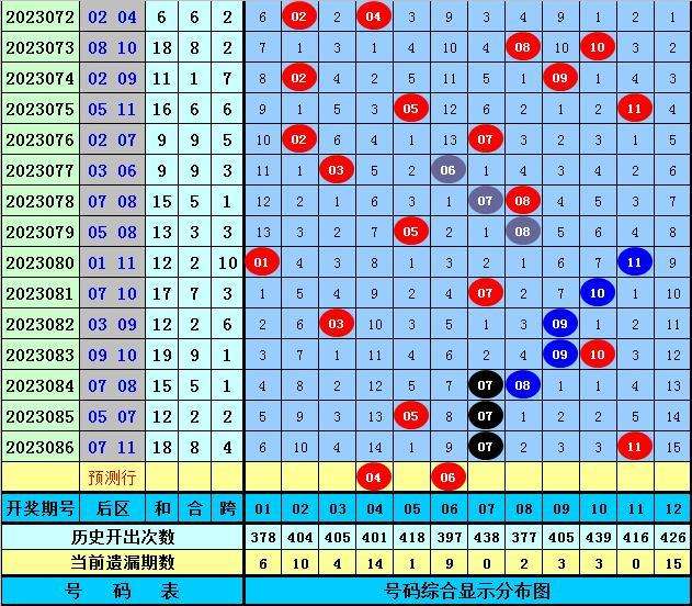 后区分析:上期后区开出奖号07和11,在最近50期开奖中,后区奖号012路落号比为28:35:37,前10期后区012路落号比为5:8:7,本期后区关注号码04、05、06、07、12,两码参考04、06。