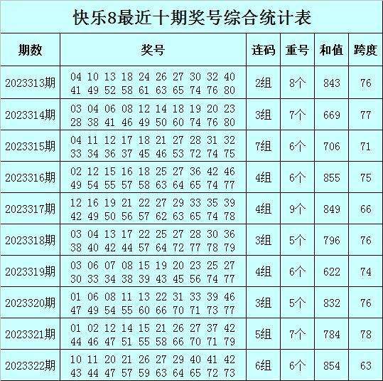 福彩快乐8第2023322期开出奖号:10 11 20 21 26 27 29 40 41 42 43 44 47 57 59 63 64 65 72 73,其中奖号和值为854,跨度为63,包含6个重号21、26、27、42、44、47,包含连码10 11、20 21、26 27、40 41 42 43 44、63 64 65、72 73。