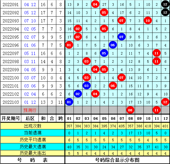 后区奇偶比1:1,后区大小比1:1,后区和值为13,后区跨度为11,与上期没有同号。