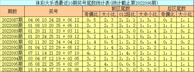 上期回顾:体彩大乐透第2022096期开出号码:16 19 24 27 33 + 01 06,其中前区奖号尾数奇偶比为3:2,大小比为3:2,012路比为3:2:0,大中小比为2:3:0,后区奖号尾数奇偶比为1:1,大小比为1:1。
