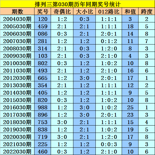 在历史同期第030期奖号中,个位号码奇偶比为9:10,012路比为10:3:6,大小比为9:10,号码波动10个点位,开出奖号为:0-9-6-1-4-3-2-3-5-4-5-0-8-6-3-8-9-5-0,本期个位看好出现偶数号码,胆码看好0。