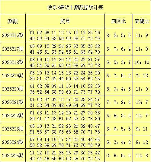 快乐8第2023225期开出奖号:11 12 15 21 25 26 29 30 35 42 43 44 46 55 62 63 65 70 73 75,其中奖号和值为842,跨度为64,012路比为7:6:7,四区比为3:6:5:6,奇偶比为12:8。