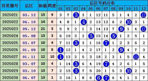 上期后区开出:06 07,和值为13,跨度为1;通过和值、跨度走势分析,本期预测推荐和值6,跨度为4