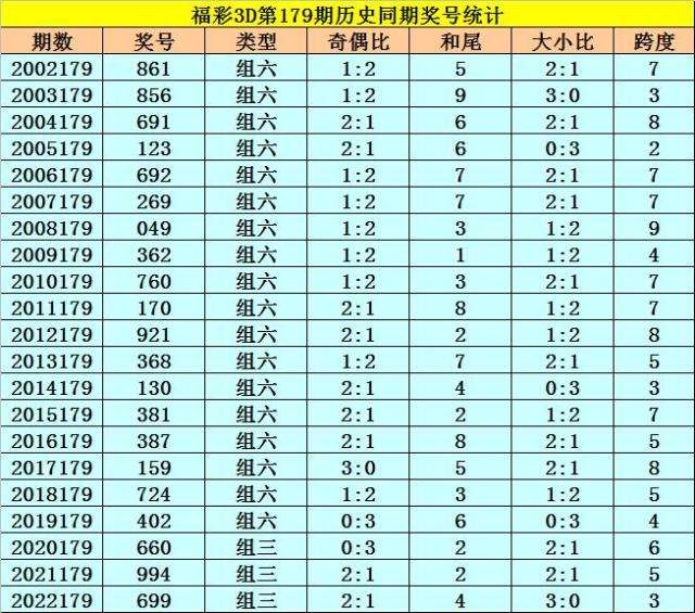 福彩3D历年第179期同期奖号为:861 856 691 123 692 269 049 362 760 170 921 368 130 381 387 159 724 402 660 994 699。