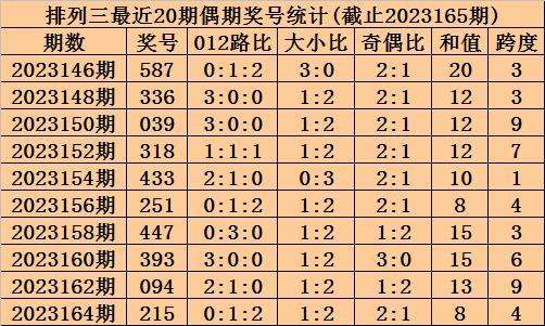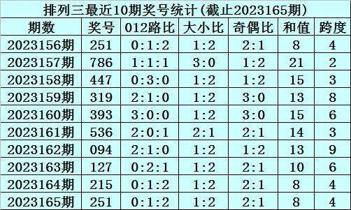上期回顾:排列三2023165期奖号为251,奇偶比为2:1,大小比为1:2,跨度为8。