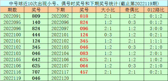 在中号球前10次开出小号、偶号类型之后,其下期分别开出奖号:818、824、096、124、345、046、083、625、064、457,其中号码奇偶比为3:7,大小比为4:6,012路比为2:3:5。