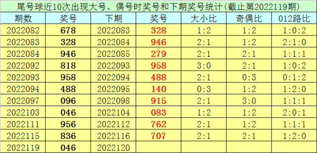 尾号球:上期奖号为6,开出大号、偶号,该位前10次开出大号、偶号的现象时其奖号分别为:678、328、946、818、958、488、096、046、956、836,其中尾号球012路比为5:0:5。