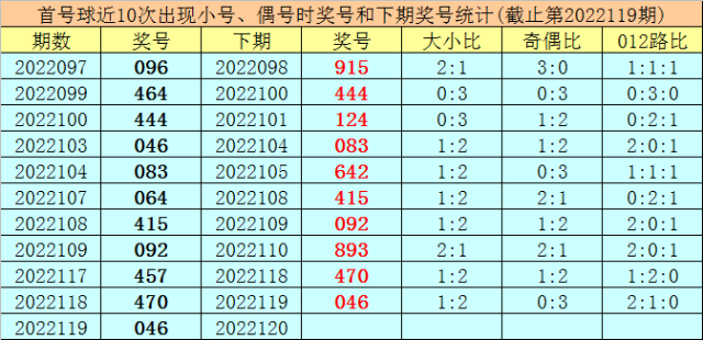 在首号球前10次开出小号、偶号类型之后,其下期分别开出奖号:915、444、124、083、642、415、092、893、470、046,其中号码012路比为5:4:1,奇偶比为2:8,大小比为3:7。