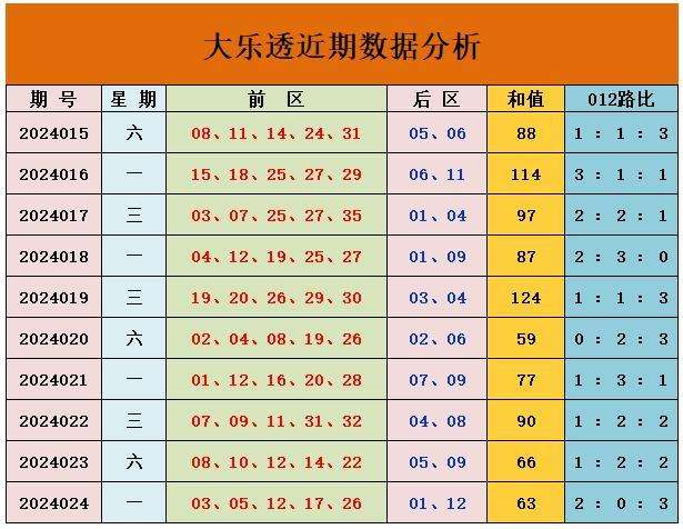 上期回顾:大乐透第2024024期奖号:前区03、05、12、17、26,后区01、12,前区奖号和值为63,三区比为3:1:1,后区开出小大组合01、12