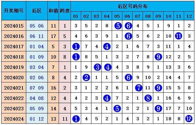 跨度分析:上期后区跨度为11,与前期相比上升7点位,预测本期跨度走势变化下降,推荐两码跨度1--5