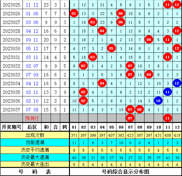 本期预计后区和值在18附近开出,后区参考号码:02、07、08、09、11。