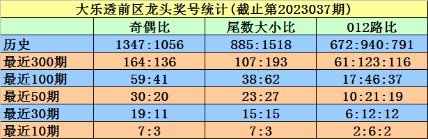 龙头号码012路比为2:6:2,奇偶比为7:3,尾数大小比为7:3。