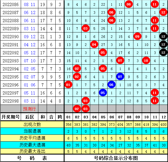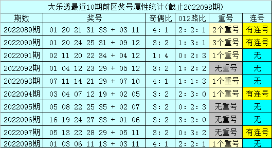 上期回顾:体彩大乐透第2022098期奖号为:01 03 06 11 13 + 03 11,其中前区号码012路比为2:2:1,奇偶比为4:1,包含1个重复号码:13。后区号码和值为14,跨度为8。
