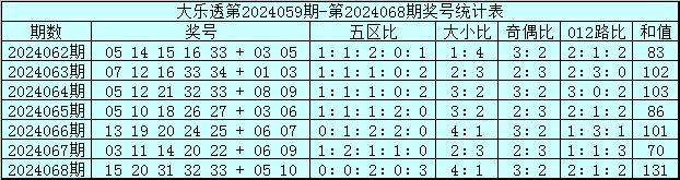 大乐透第24068期开出号码:15 20 31 32 33 + 05 10,其中前区五区比为0:0:2:0:3,大小比为4:1,奇偶比为3:2,012路比为2:1:2,和值为131,后区奇偶比1:1,大小比1:1。