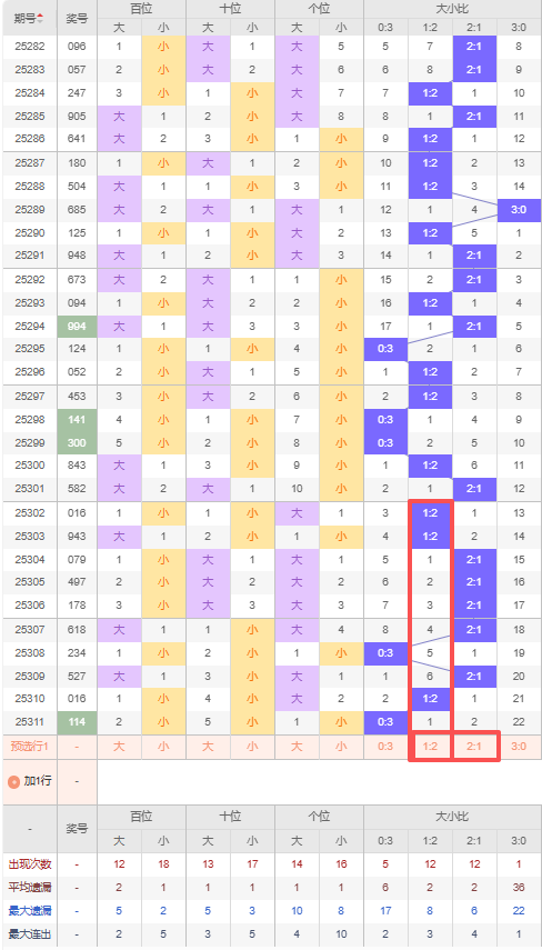 上期大小比:0:3,近10期大小比出现情况:1:2、1:2、2:1、2:1、2:1、2:1、0:3、2:1、1:2、0:3,最近10期出5期2:1,出现3期1:2,出现2期0:3,出现0期3:0,根据近10期出号规律本期推荐遗漏2期出2:1,防隔期出1:2,综上所述大小比推荐:防:1:2,重点关注:2:1。