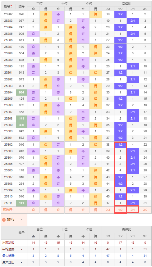 上期奇偶比:2:1,近10期奇偶比出现情况:1:2、2:1、2:1、2:1、2:1、1:2、1:2、2:1、1:2、2:1,最近10期出现6期2:1,出现4期1:2,出现0期0:3,出现0期3:0,根据近10期出号规律本期推荐隔期出1:2,防连出2:1,综上所述奇偶比推荐:防:2:1,重点关注:1:2。
