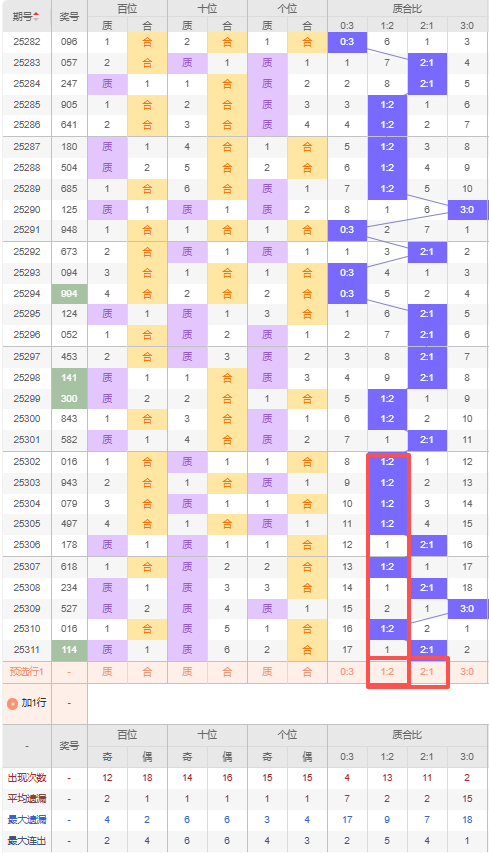 上期质合比:2:1,近10期质合比出现情况:1:2、1:2、1:2、1:2、2:1、1:2、2:1、3:0、1:2、2:1,最近10期出现3期2:1,出现6期1:2,出现10期0:3,出现1期3:0,根据近10期规律本期推荐隔期出1:2,防连出2:1,综上所述质合比推荐:防:2:1,重点关注:1:2。