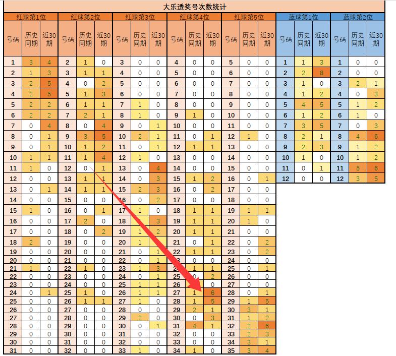 第5位,23-35是热门范围,历史同期热门号码为30-34-35,近期热门号码为32,建议重点关注29-30-32-33-34-35;