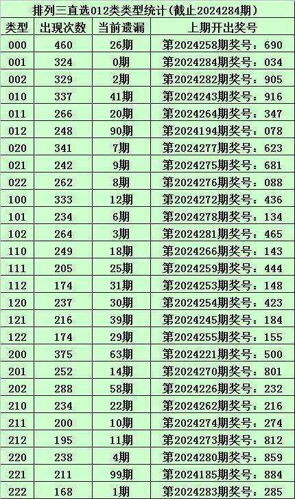 上期回顾:体彩排列三第2024284期开出奖号:034,其012路比为2:1:0,奖号012路类型为:001。