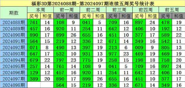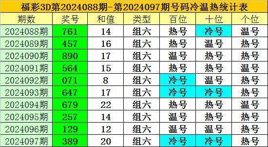 上期回顾:福彩3D第2024097期开奖奖号为:389,奖号类型为:组六,奖号冷温热态为:冷号+冷号+热号。