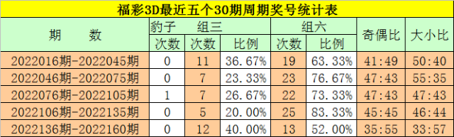 在最近一个30期周期内(第2022136期-第2022165期),豹子奖号没有出现,组三奖号开出了12次,所占比例为48%,组六奖号共出现13期,开出比例为52%,组六号码轮空1期,本期重点关注组六号码出现。