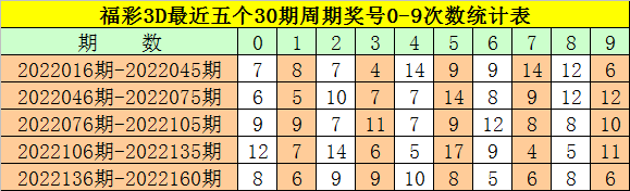 大小分析:在上一个30期周期内(第2022106期-第2022135期),奖号大小比为46:44,大小号码开出比例基本持平;在但前30期周期内(第2022136期-第2022165期),3D开奖大小比为33:57,大号走势相对低迷。大号上期热出,本期关注大号再次走热,预计大小比为2:1。