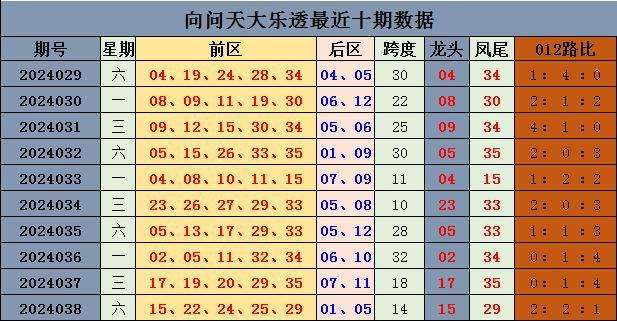 上期回顾:大乐透第2024038开奖,本期奖号:前区15 22 24 25 29;后区01 05。当期前区号码大小比为4:1,三区比0:3:2,奇偶比3:2。前区开出连号24 25,开出重号29。