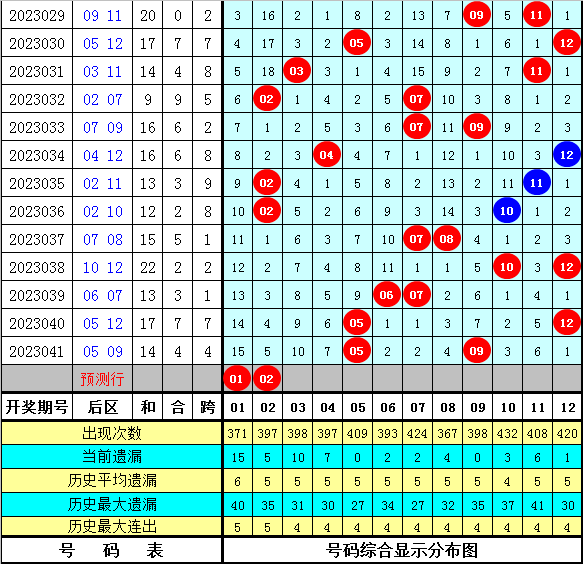 第2023042期后区奖号分析:后区最近五期开出奖号组合为:07+08、10+12、06+07、05+12、05+09,其中一奇一偶组合开出3次,全奇组合开出1次,全偶组合开出1次,本期后区关注一奇一偶组合,参考号码01、02。