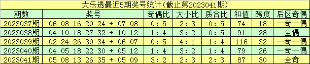 最近5期前区奇偶比分别开出0:5、1:4、0:5、1:4、3:2,奇偶比总比例为5:20,奇数号码表现较冷,本期防止奇数号码回补,预计开出奇偶比3:2。