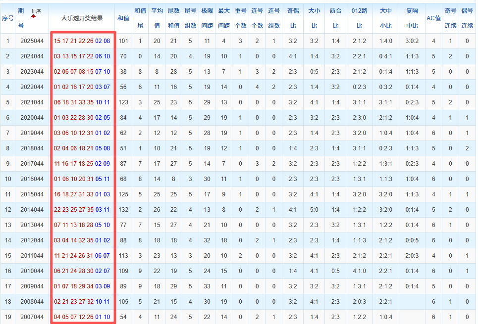 通过观察,我发现往年同期的开奖数据与本期号码之间存在显著关联。具体来说,在前区号码中,从第一位至第五位,通常会有约三个位置上的数字与往年同期相同位置的号码一致;而后区号码中,也有多期开奖结果直接包含了往年同期的数字。因此,我们可以借助往年同期各位置上的号码,作为分析本期开奖情况的重要依据。在此基础上,还可结合往年同期的其他相关条件,进行综合性的号码组合推荐。