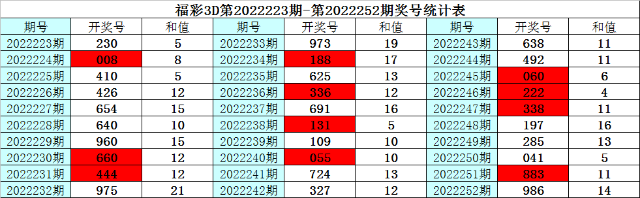 上期回顾:福彩3D第2022252期奖号为:986,其中奖号组选类型为:组六,奇偶比为1:2,大小比为3:0,012路比为2:0:1,和值为23,跨度为3。