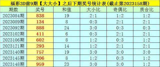 5、在下期奖号中,号码大小比为:2:1、0:3、3:0、0:3、1:2、1:2、3:0、1:2、3:0,号码大小比总比例为14:13,本期注意小号热出,看好大小比为1:2。