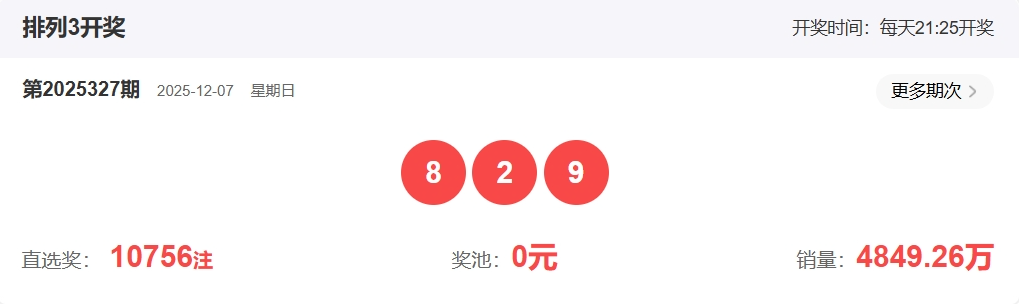 排列三第2025327期开奖回顾:开奖号码:829 形态:组六
