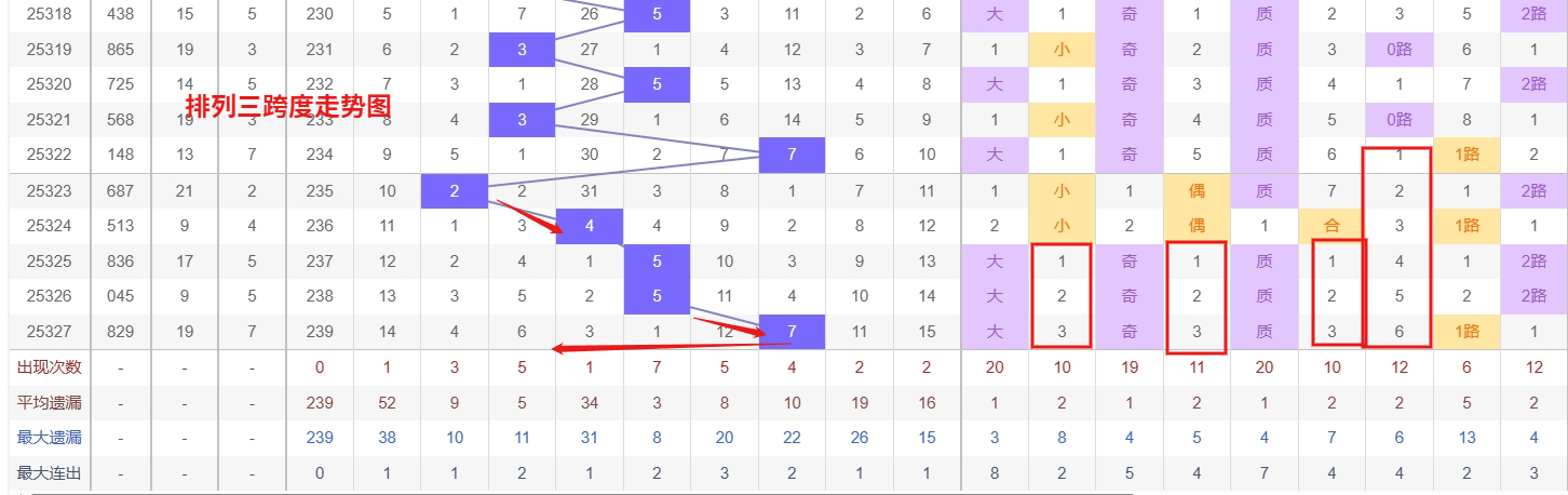 排列三 跨度分析:从上图可以看出近100期的跨度大小比约为48比52,跨度奇偶比约为47比53总体来看还是比较均衡的,但跨度大小之间有点差异。我们再从历史开出7跨后下一期2跨度数据来做参考。最近10期跨度大小比约为4:6期开出小数跨度过多返回大数跨度的概率更高一点。历史开奖近2期出7跨以后的走势为256期开出7跨后下一期走2跨走出5振幅,第266期开出2跨后下一期走6跨走出4振幅第283期开出7跨后下一期开出3跨走出4个振幅。连续多期大振幅,近期排列三跨度走势分析,跨度3与跨度6持续活跃,已形成明确的热态特征,热跨往往具备较强的走势惯性,短期内再次开出的可能性较高,与此同时,跨度8已平均遗漏多期,处于明显的冷态区间,其遗漏值不断累积带来较大的理论回补压力,本期预计跨度遵从历史会走出大振幅,出7跨度后容易走出1到5个跨度振幅的对称形态,跨度走出1到5个振幅看好的跨度有2368跨,所以第2025328期排列三跨度推荐2368跨。
