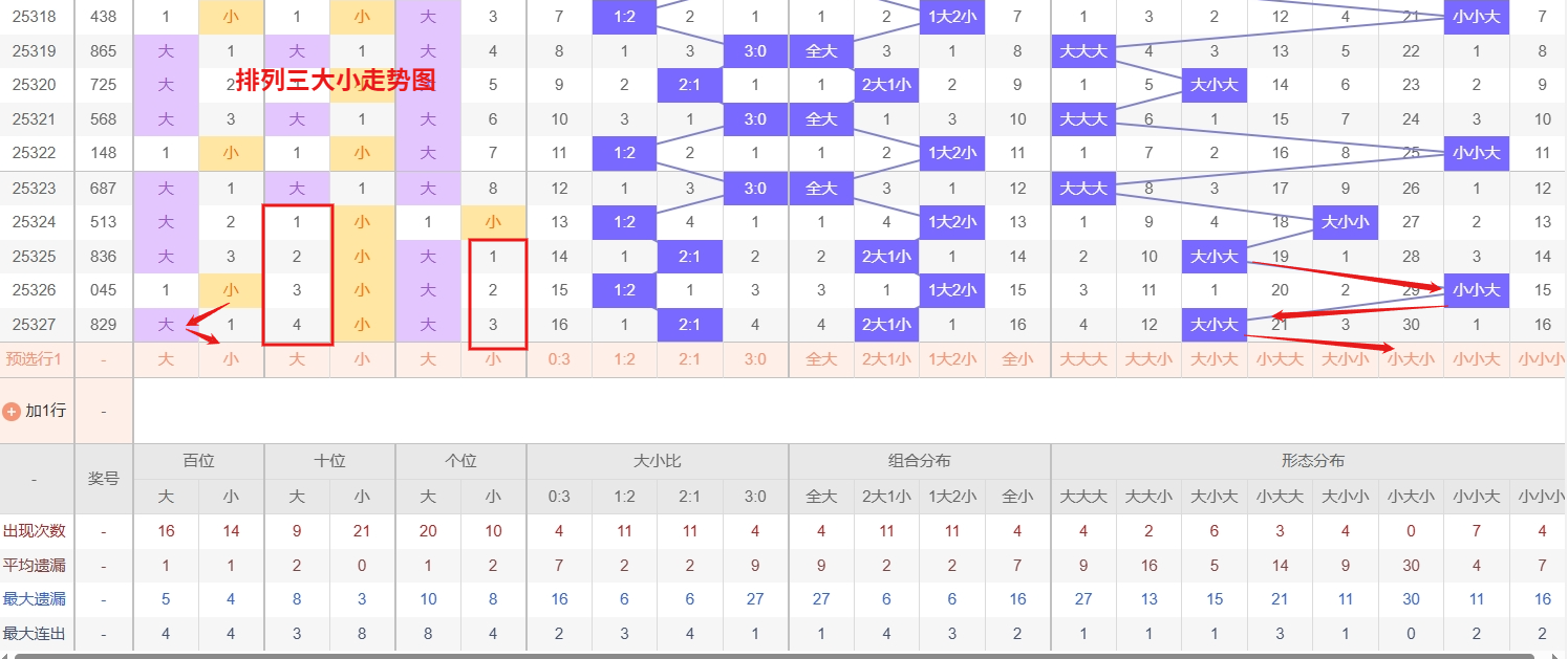 排列三 大小形态分析:从大小走势图上可以看出排列三100期内百位大小比约为52比48,十位大小比约为47:53,个位大小比约为54比46,除了个位和百位奇数比偶数多,十位是偶数比奇数多。历史数据近2期开出大小大下一期的走势为,第247期开出大小大第248期开小大大。第276期开出大小大后第277期开大大小,第284期开出大小大后285期开小大小。近期排列三大小走势分析,“小大小”与“小大大”这两种形态均已遗漏较长时间,其中“小大小”更已连续30期未出,进入深度冷态区间,形成显著的回补压力。历史规律表明,大小形态在经历长期遗漏后,往往会出现周期性反弹,尤其当某一形态达到极端遗漏值时,其解冻概率会明显上升。目前整体大小走势虽由其他热门形态主导,但冷态蓄积的能量也在不断增强,短期内需密切关注“小大小”与“小大大”可能出现的技术性回补。所以排列三第2025328期大小形态推荐小大大防小大小。