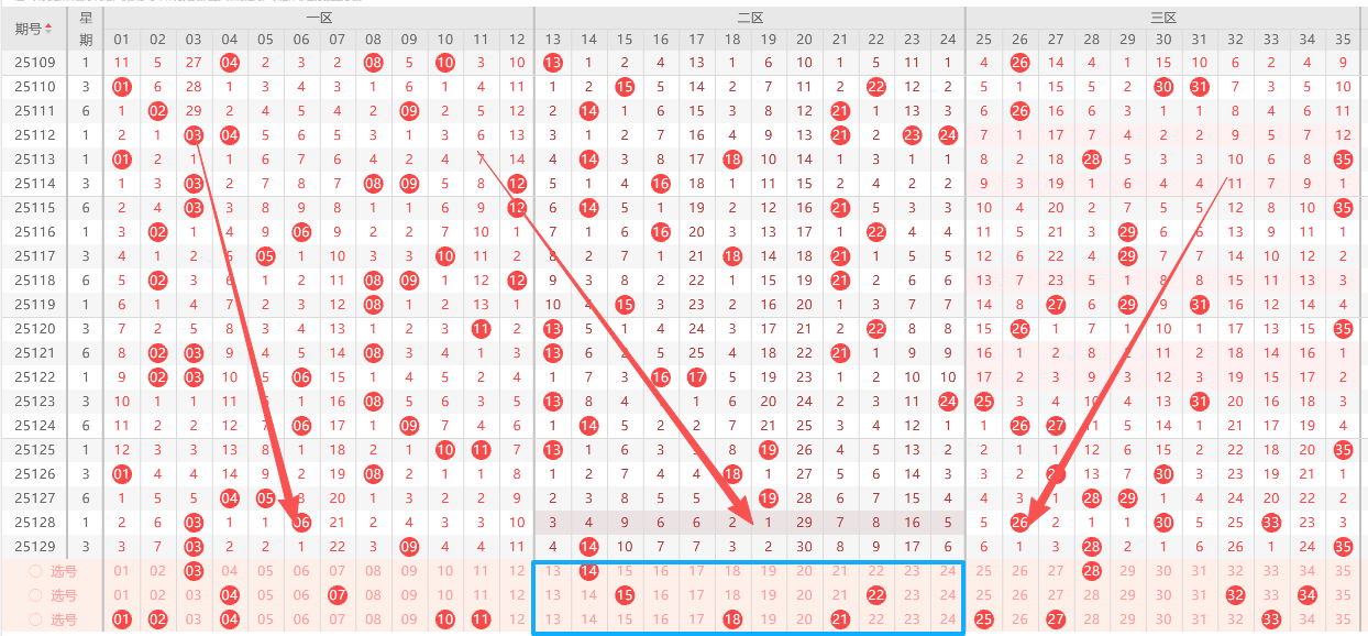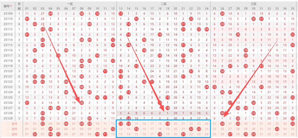 本期3区号码,总体分析如下(蝴蝶根据概率算法,结合大数据统计,总结出一套不错的算法,总体的3区分析如下):