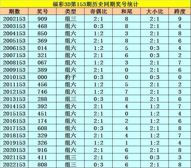 福彩3D历年第153期同期奖号为:909 468 850 369 014 321 067 389 000 456 746 288 392 451 174 608 329 326 916 411 808。