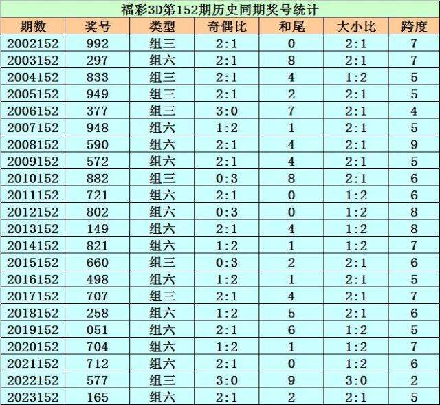福彩3D历年第152期同期奖号为:992 297 833 949 377 948 590 572 882 721 802 149 821 660 498 707 258 051 704 712 577 165。