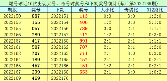 在尾号球前10次开出大号、奇号类型之后,其下期分别开出奖号:113、406、789、417、891、707、771、457、451、553,其中号码奇偶比为9:1,大小比为5:5,012路比为4:6:0。