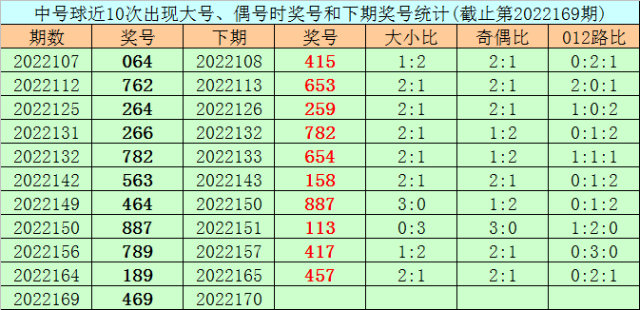 开奖回顾:体彩排列三第2022169期开出奖号469,奖号大小比开出2:1,奇偶比开出1:2,012路比开出2:1:0。