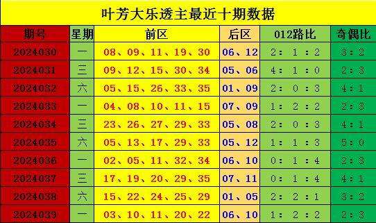 040期叶芳大乐透预测奖号:012路比奇偶比分析