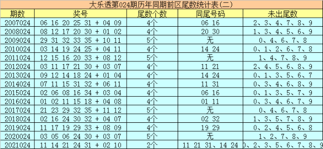 大乐透历年同期第024期后区尾数奇偶比为14:16,最近5年尾数奇偶比为5:5,后区尾数大小比为9:21,最近5年尾数大小比为4:6,本期后区注意号码03、04、05、07、08,后区两码关注04、05。