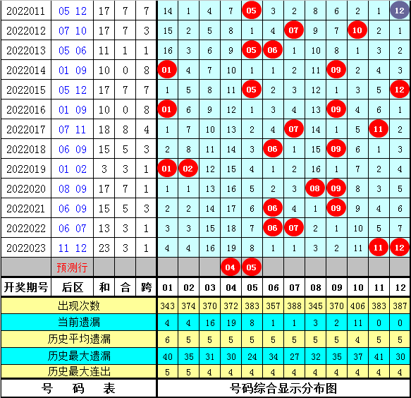 上期回顾:大乐透第2022023期开出奖号:04 05 18 20 25 + 11 12,前区包含4个尾数:0、4、5、8,后区开出一奇一偶、全大组合。