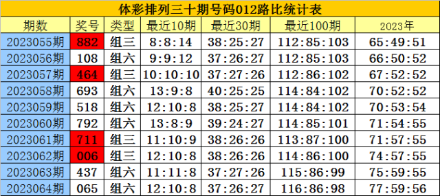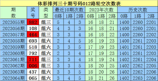 开奖回顾:排列三第2023064期奖号为:065,号码012路比为2:0:1。