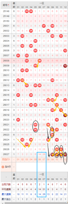 二区选号首先关注冷号33号、34号都已经遗漏了十期以上,且到达自身最大遗漏周期,其中33号都已经远超平均遗漏期数,建议可以防冷号开出。其次34号也同理已经遗漏十期以上,且到达最大遗漏期数,可以防冷号开出。另外本期二区个人觉得不会开超过两码,多关注该区冷号,防冷号开出就行。隔断号可以考虑28号,若本期开出将形成1-2的形态规律。还可以考虑26号,若开出将形成2-1的形态规律。