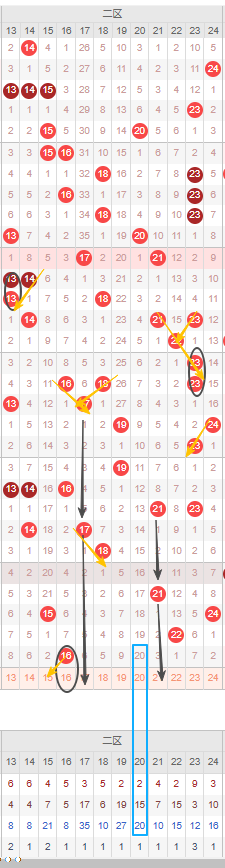 由图可见二区的重号几率并不算很小,近20期开出了2次重号,而上次开出重号已经间隔多期,本期可以考虑继续开出上期开出的16号重号。邻号可以考虑上期开出的16号的邻号15号。隔断号可以考虑17号,若本期开出将形成6-6的形态规律,21号同理,若开出将形成2-3形态规律。