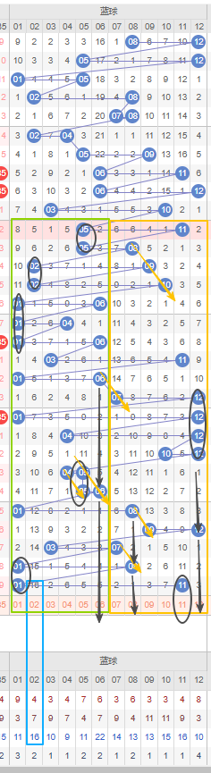 大小号形态:上期开出的一大一小形态,蓝球近20期开出一大一小形态的期数占了半数,那么本期再次开出一大一小形态的概率是很大的,建议看好一大一小形态。比如小号02号和上期开出的11号,不仅是一大一小形态,并且02号都已经遗漏十期以上,且已达到最大遗漏期数,建议防冷号开出。11号还可以考虑本期开出重号。