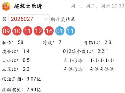大乐透第2026027期开奖号码:9、10、11、12、16、+ 01、11, 开出一等奖3注,奖池累计奖金:7.99亿元 ,详细数据见下图: