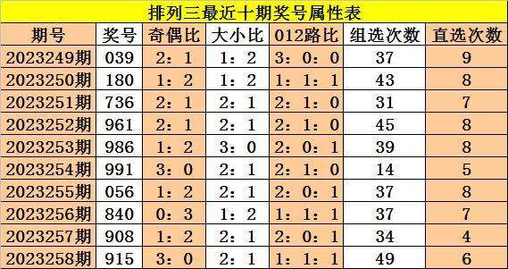 上期回顾:体彩排列三第2023258期奖号:915,奇偶比3:0,大小比2:1,012比1:1:1。