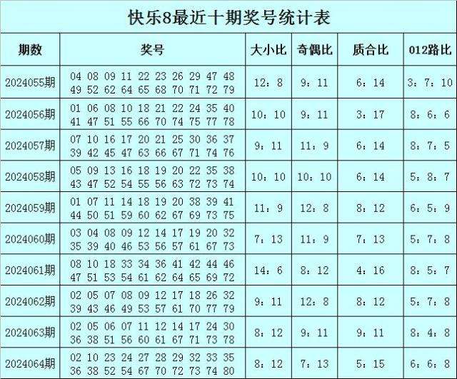 福彩快乐8第2024064期开奖回顾:02 10 23 24 27 28 29 32 33 35 36 38 52 54 67 70 72 73 74 80,其中奖号大小比开出8:12,奇偶比开出7:13,质合比开出5:15,012路比开出6:6:8。